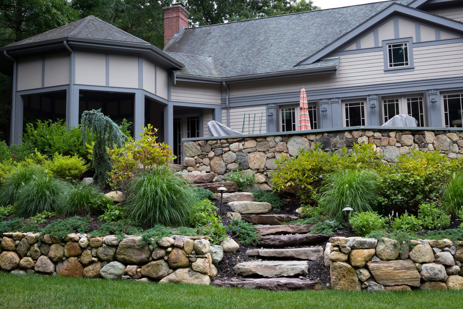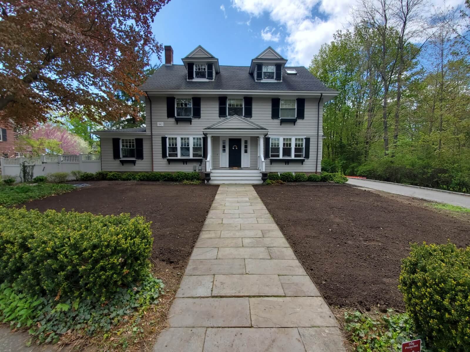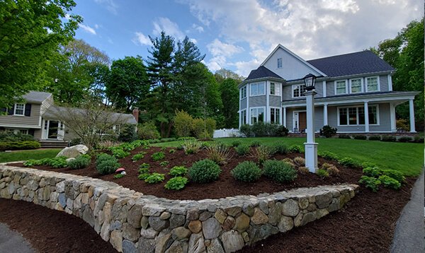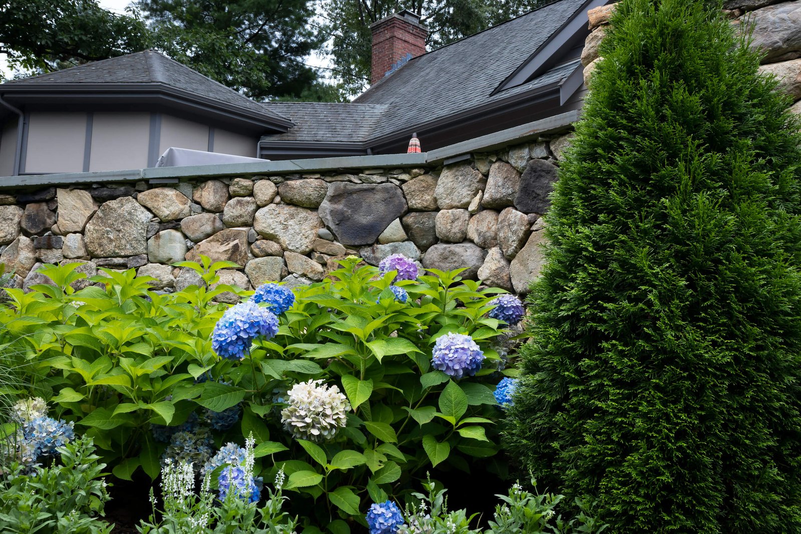 Varieties of hydrangea, ground covers, and some specimen trees including a specimen white oak tree are thoughtfully placed throughout the property to create privacy and a beautiful outdoor space for our homeowners. With an updated irrigation system, the newly laid sod and front foundation plantings will thrive. To complete the project, we finished construction on a stunning New England fieldstone wall which accents the house beautifully and will last throughout all seasons.