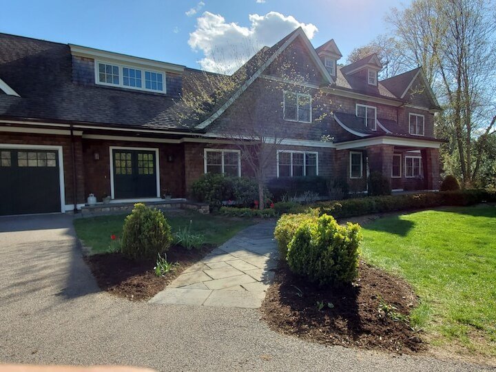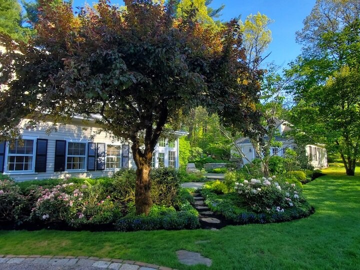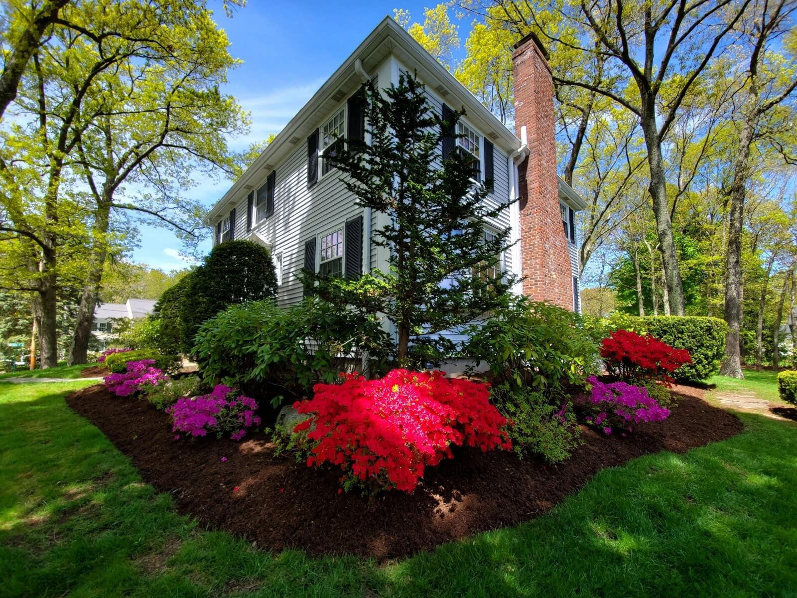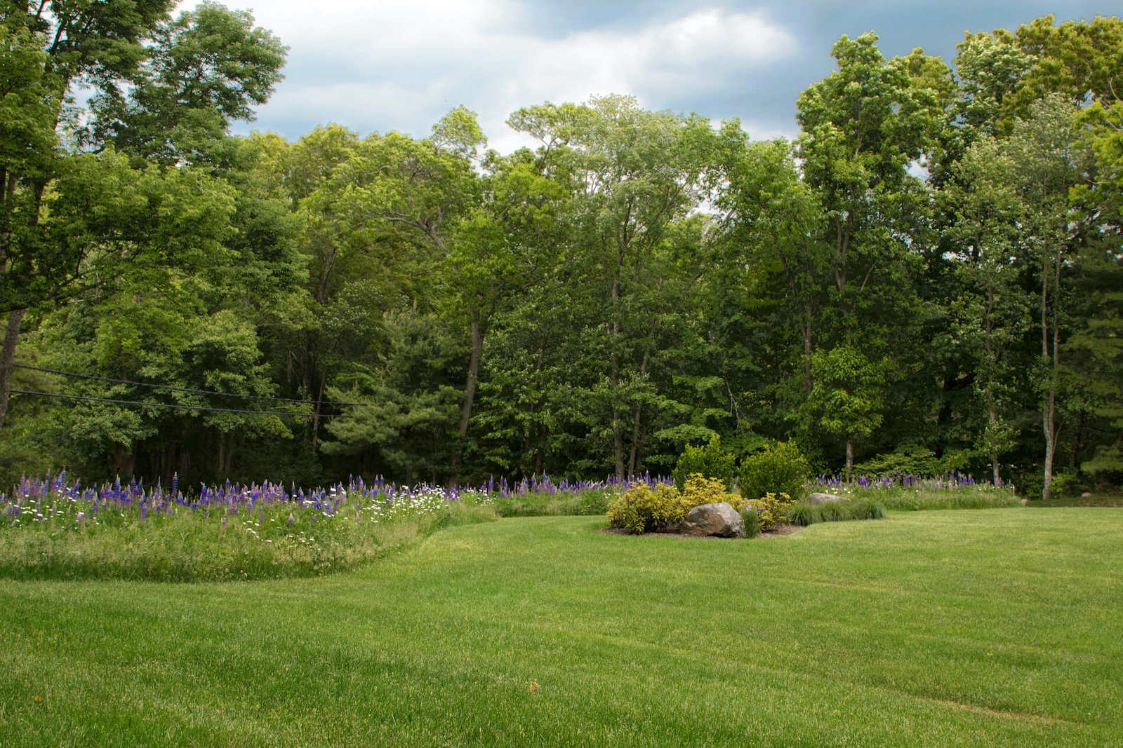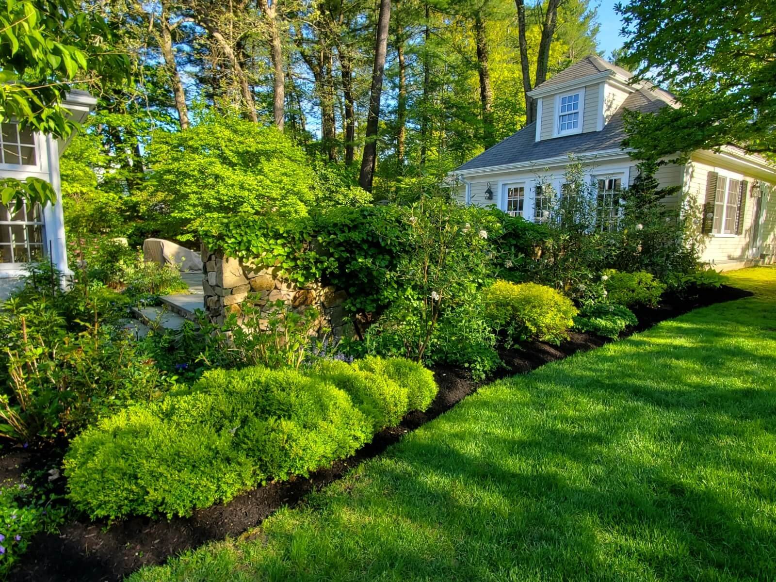 Varieties of hydrangea, ground covers, and some specimen trees including a specimen white oak tree are thoughtfully placed throughout the property to create privacy and a beautiful outdoor space for our homeowners. With an updated irrigation system, the newly laid sod and front foundation plantings will thrive. To complete the project, we finished construction on a stunning New England fieldstone wall which accents the house beautifully and will last throughout all seasons.