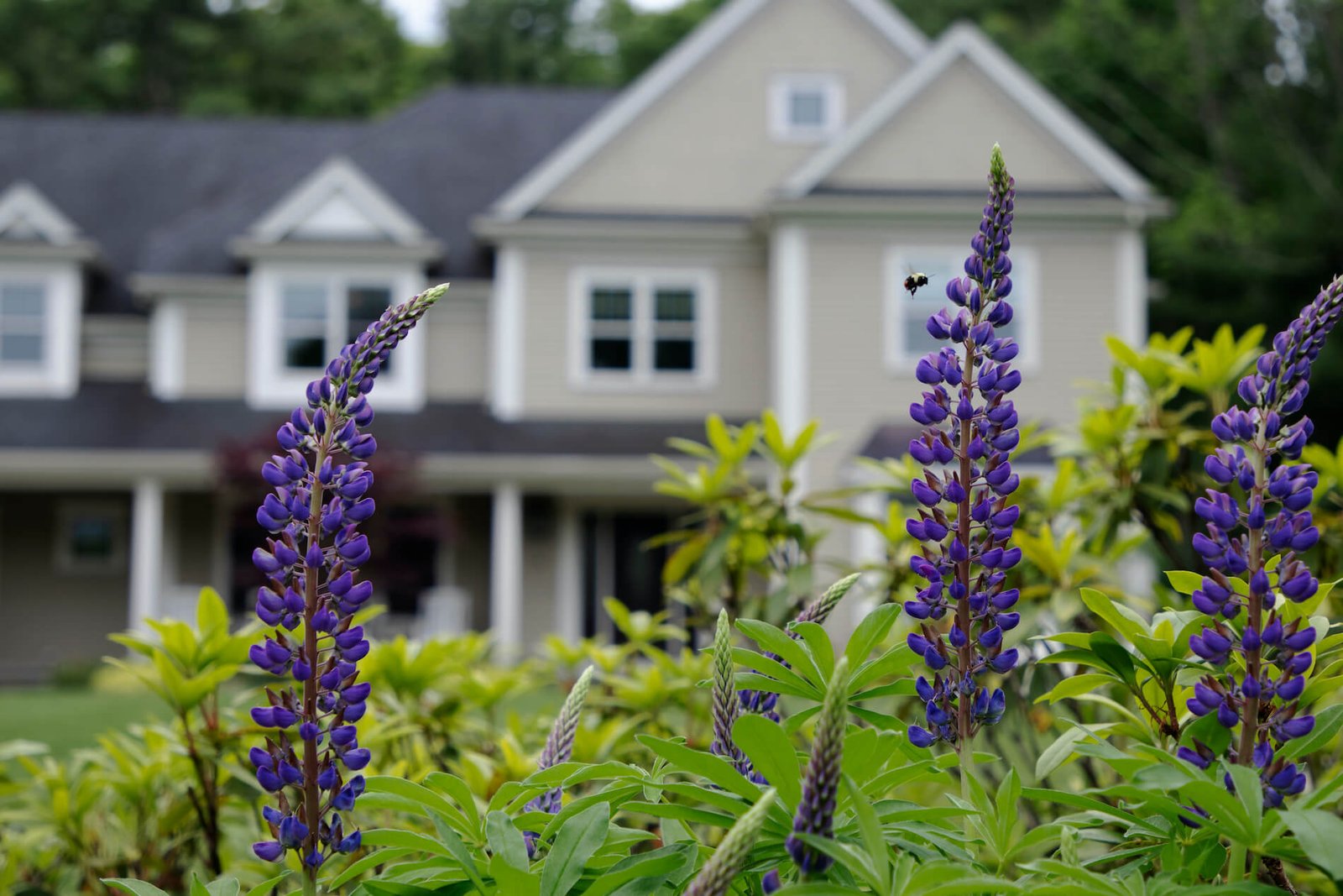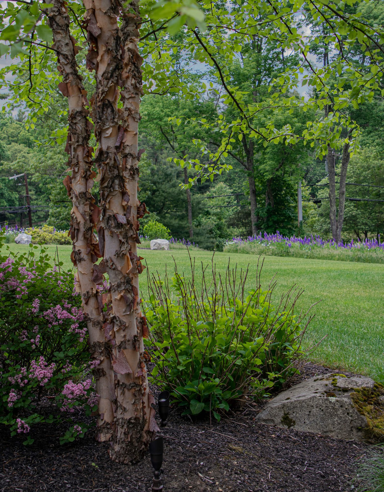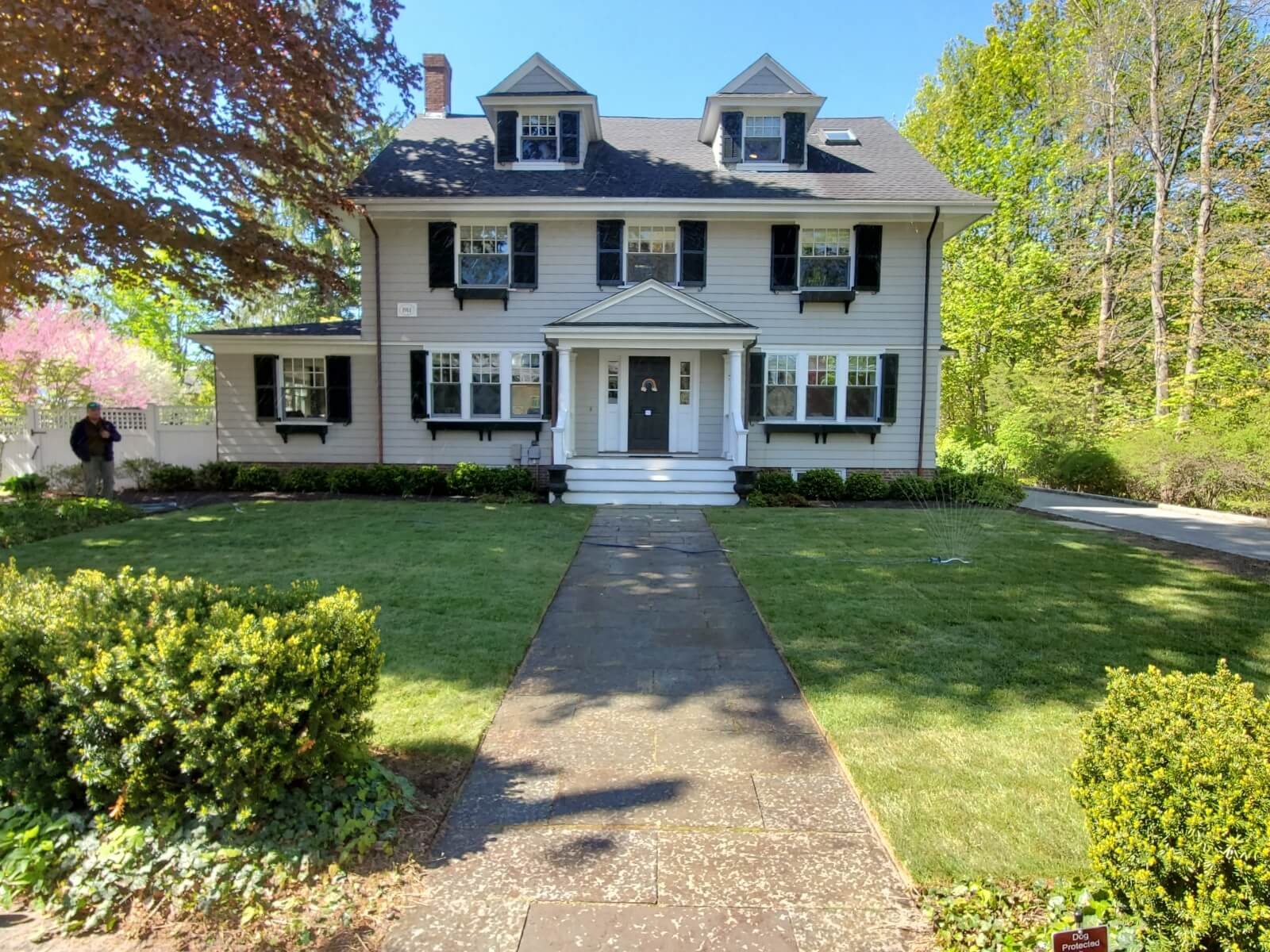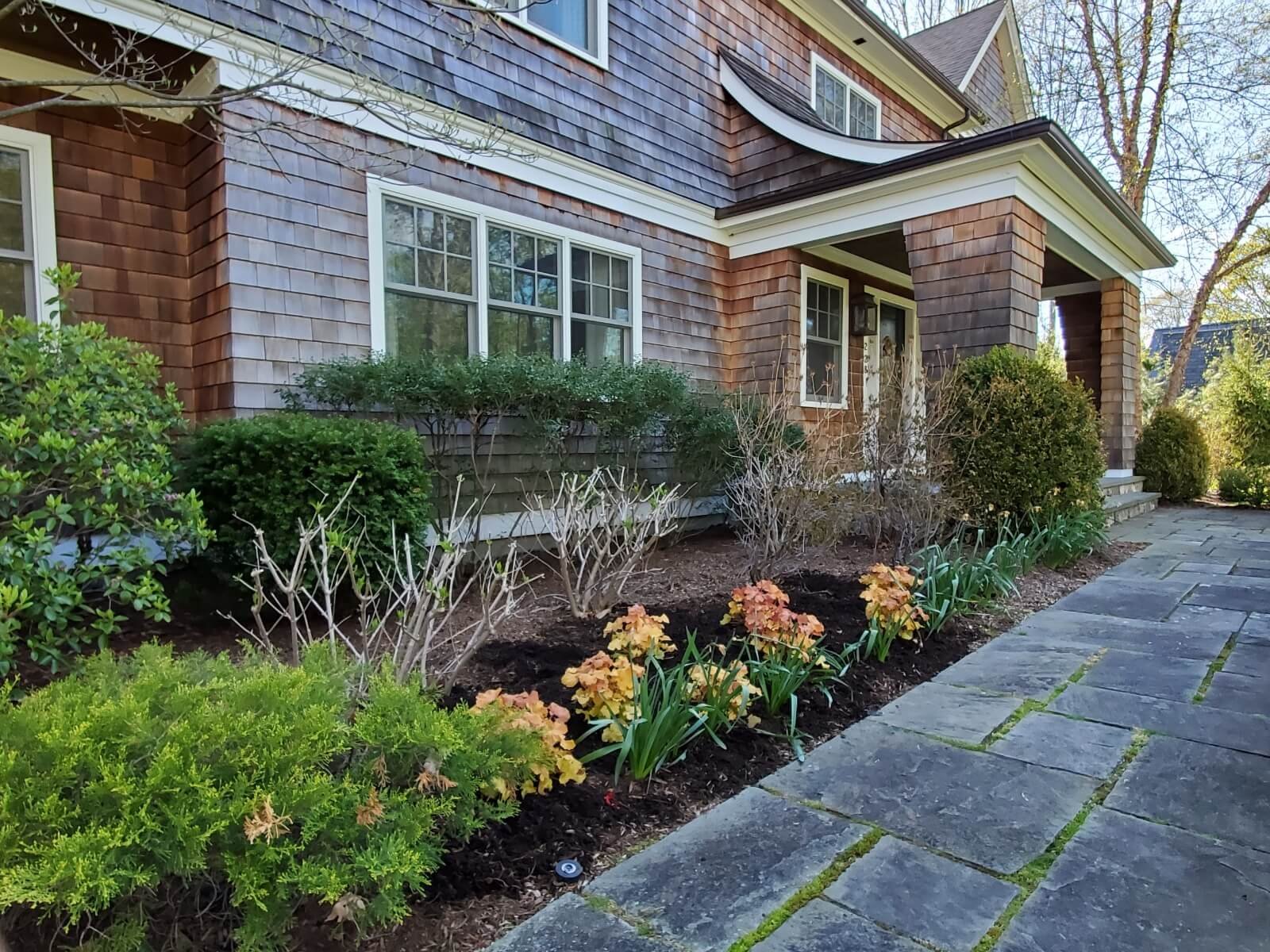 Varieties of hydrangea, ground covers, and some specimen trees including a specimen white oak tree are thoughtfully placed throughout the property to create privacy and a beautiful outdoor space for our homeowners. With an updated irrigation system, the newly laid sod and front foundation plantings will thrive. To complete the project, we finished construction on a stunning New England fieldstone wall which accents the house beautifully and will last throughout all seasons.