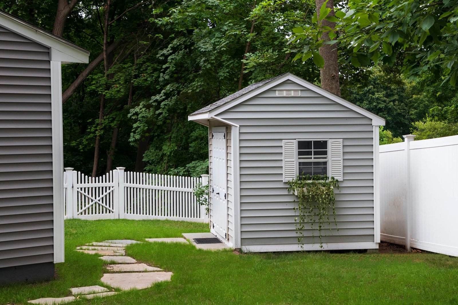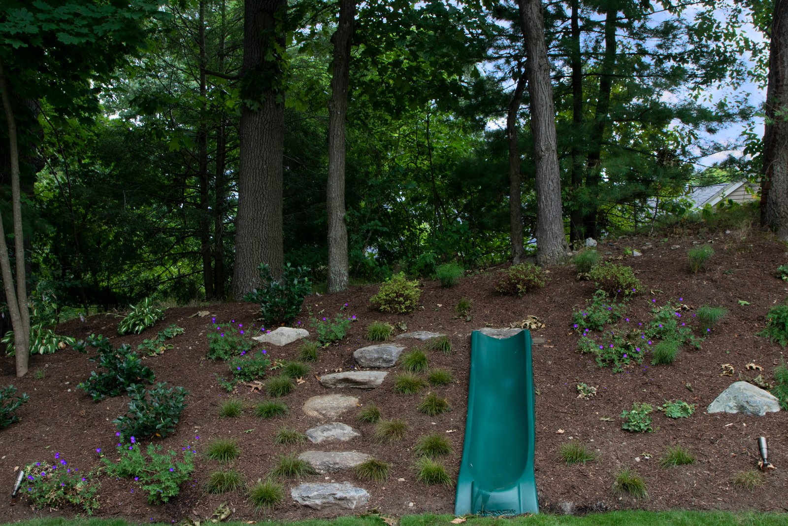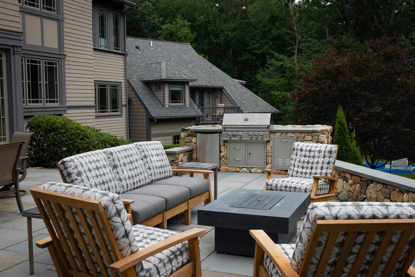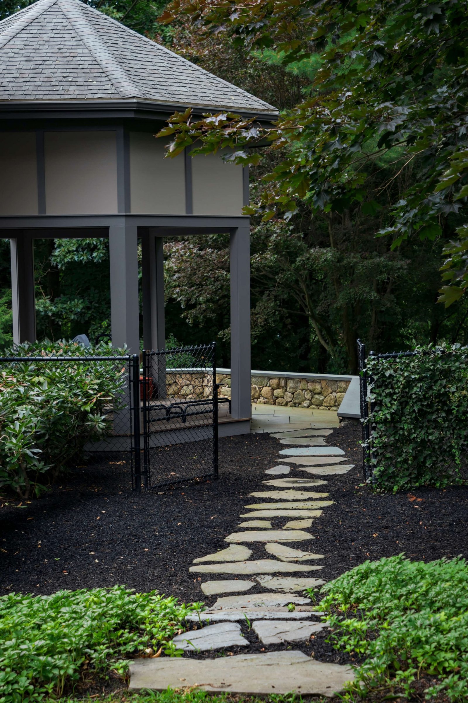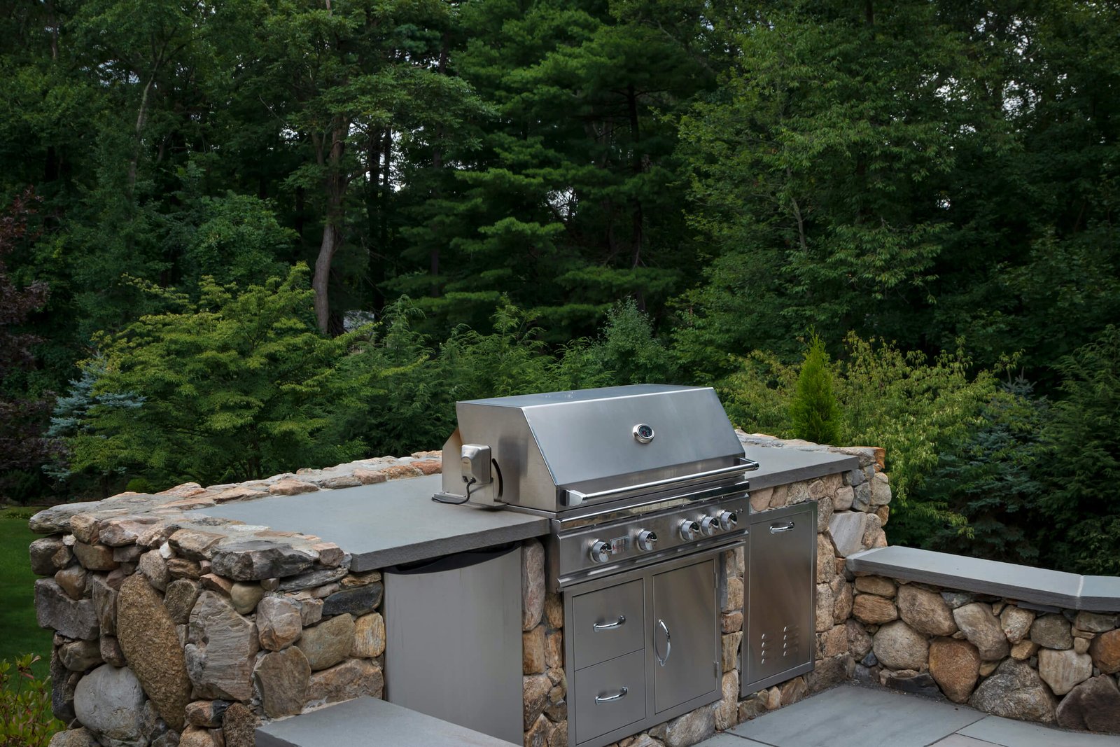 A raised patio featuring a custom built kitchen island grill and fire pit is the perfect outdoor area for large gatherings or quiet family nights. There is no lack of seating with a wrap around seat wall built with New England fieldstone and finished with bluestone caps. Garden path steppers meander through sloped planting beds, complete with beautiful ambient lighting. This backyard is an oasis for all types of get-togethers.